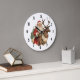 En klocka med en roligt julillustration. Jultomten i sitt traditionella röda kostym rider en stor, skrynklig renar som dekoreras med holly. En Julgran i baksidan.