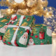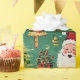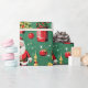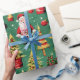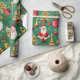 En papper omslutning med retro Santas i gröntens bakgrund med träd, ljus, presenter och prydnadsföremål är en fin och klassisk design som utstrålar en härlig helgdag charm. Den pappra inslagningen fångar kärnan i en gammal tid och framkallar nostalgi- och värmekänslor. Det är ett val av perfekt för att slå in presenter under julhelgen, ta med en aning tidlös charm och fräckt glädje till presenter.