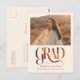 Celebrate your graduate with this elegant photo graduation invitation postcard featuring warm golden tones and modern retro typography. Perfect for a high school or university college grad party, its simple clean chic layout highlights your favorite portrait and event details beautifully. Easily personalize names, date, and location to match your celebration style. Create a trendy class of keepsake and invite guests in style, personalize yours today.