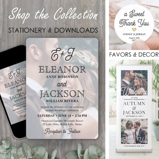Inbjudan familj och vänner till en helt enkelt elegant bröllop firande med snyggt som monogrammerade fotoinbjudningsmagneter. Bild och alla formuleringar i den här mallen är enkla att anpassa och bakgrunden gör dem lätta för vänner och familj att visning. (IMAGE PLACEMENT TIP: Ett enkelt sätt att placera ett foto exakt på vilket sätt du vill är att lägga upp det i skörd innan du laddar upp det på Zazzles webbplats.) Den övergripande estetiska bilden av denna design är chic och modern med lite vintage. Den har en bild av det förlovade paret överlagrad med trendig-retroskriptkalligrafi och klassisk serif-typografi. Alla ceremonier och mottagningsformuleringar kan anpassas eller tas bort. Detta unika svarta och vita magnetiska inbjudningskort gör att en elegant läggs till i ett speciellt firande. Grattisar till bruden och brudgummen!