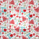 Vintage: mönster med plattor, blandare, köksredskap och blommor i nyans av rosa, rött och blått. Perfekt för shabby chic köksprojekt.