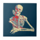 Lycklig leende skelett med sin beniga hand vilande på hakan, utförd i färg.