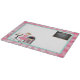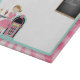 En gullig skärbräda med ett retro sodavatten shoppar tema med flickan i pudelkjol, stiger ombord jukeboxen och menyn med den rosa solstrålgränsen och musik noter.
