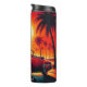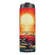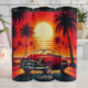 Den här stiliserade illustrationen har en klassisk röd konvertibel som parkeras på en väg vid solnedgång. Det stora, pulserande sol sätter sig över havet och dess ljus reflekterar över vatten. Handflatan träd tystas ned mot det varma, orange-röda himmel, och skapar en nostalgisk och reflekterande påminnelse om en vintage resor-poster.