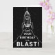 Den svarta och vita designen i Retro-mitten av århundradet har en avblästring av raketfrakter. Hoppas att din födelsedag är en smäll. Vit text på svart bakgrund.
