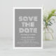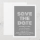 Retro Spara datum-anmälan i grått och vitt med en funky modern typsnittsdesign. Denna trendiga och stilrena spara datum-inbjudan är enkel att anpassa med dina bröllopsdetaljer. För fler anpassningsalternativ, klicka på knappen Anpassa.