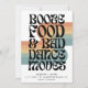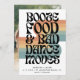 Lustigt bröllop spara datum-kort i ett 70-tal inspirerat teckensnitt som lyder - Sprit, mat och dålig dans rör sig. Lägg till informationen om bröllop på framsidan och fotot på baksidan.