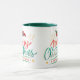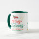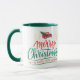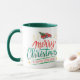 Det unika kaffet mugg har en stiliserad typografi som säger "God jul och Gott nytt år" i röd och teal grönt. Ovanför texten finns en liten bild av lastbil som visas med en nyklippt Helgdag träd i den. Guld-snurrar och stjärnor ökar intresset. Bilder och text trycks på två sidor av mugg. Klassisk och snyggt för Julhelgen.