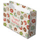 En glad födelsedagspresentbag med ett sött mönster med munkar som ramlar runt omkring. Rosa, gröna, bruna och krämfärgade färger ger verkligen denna design en cool retro-känsla.