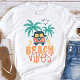 Denna söta "Beach Vibes"-t-shirt kommer att transportera dig till din lyckliga plats. Skaffa en till dig själv eller till den strandälskaren i ditt liv!
