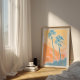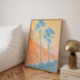 Capture the essence of a tropical sunset, sundaze, with this vibrant, stylized palm tree art featuring a stunning blue and orange color palette. Its grainy, vintage-inspired texture and bold minimalist design make it the perfect statement piece for a coastal home, California-style living room, or modern beach house gallery wall.