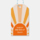 Orange, persiko - och krämretro solskenarch ram typografi grattis på födelsedagen presentmärkre. Anpassa enkelt texten för dessa leverantörer av födelsedagsfester med hjälp av den mall som tillhandahålls.