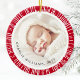 Röd dekoration med dina anpassningsbar-foton inuti ett retro sunburst gräns. Anpassade som övertäckning över fotona.