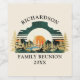 Skapa personlig familjeåterförening vin-etiketter för ditt outdoorsy temaparty. Utformningen har ett solnedgångslandskap med bergsområden, en skog i träd och sjö på en beige vintage. Skriv in din familj namn och år via mallen för att anpassa den.