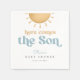 De här "här kommer sonens" babyduschservetter kombinerar boho charm med en retroflair, skapar det som ett idealiskt val för din solskemannade babydusch med gult och blåtoner. Fira i stil och gör er speciella dag minnesvärd.