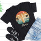 Denna personliga könsneutrala t-shirt har en cool surfbräda, rullande retroinspirerade vågor och minimalistiska silhuetter av palmer. Designen blandar djärva vintagefärger för en nostalgisk surf-estetik.