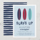 Födelsedagsfest inbjudan för din lilla killes surfa eller vid bäckenet har en trio av vintage yfboard illustrationer i marin, röd och akvatisk. "Surfans uppåt" visas i återutskriften, med information om födelsedagsfesten under.