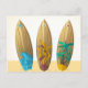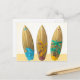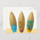 Berätta för dina vänner om din fantastiska helgdag med det här vykortet! En utformning av tre reflekterande ytor av trä som står samman på sanden. Konstruktionerna omfattar blått vågar, delfiner och handflatan träd. Det här är coola, höft och perfekt för älskare på stranden, sommar och surfa.