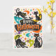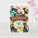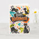 En djärv, lekfull halloweenillustration som sprudlar av modernistisk charm från mitten av 1900-talet. Fyra stiliserade svarta katter gör busiga poser runt en dramatisk "Happy Halloween"-banner, deras ljusa ögon lyser i gult, orange och lila. Kompositionen ges energi av atomålderns stjärnexplosioner, halvmånar, prickar och svepande former i en livlig palett av teal, chartreuse, orange, violett och svart. Med sin rena stil, sin fantasifulla rörelse och retro-futuristiska flärd känns designen rolig, festlig och förtjusande kitschig.