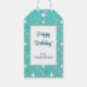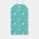 En märkre med anpassningsbar med skript och serif brev på en retro atomic star mönster i teal och vit på en lätt teal bakgrund.