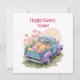 This heartwarming watercolor design features a retro two-tone pickup truck in teal blue and soft purple, driving away into a sunny spring day. The truck bed is overflowing with giant, colorful Easter eggs and blooming pink flowers, capturing the pure joy of the holiday.