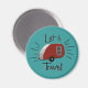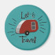 Den nya utformningen på denna magnet påminner om tryckannonser från 50-talet och tidigt 60-talet med en fyrhjuling i vintage rött och silver och frasen "Låt oss resa!" Från min digitalt skapat originalbild.