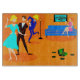 Den här Retro Tecknad Cocktail-skärningsnämnden Party har inget inåtvänt ben i sin kropp! Den moderna designen i mitten av århundradet har en levande tecknad teckning i ett vardagsrum och en livlig cocktail party. Det finns ett attraktivt par på dansen golv. Den blonda kvinnan i en turkoklänning och hennes höga, mörk och stilig eskort dansar cha-cha. På golv finns det en postspelare i grönten omgiven av vinylskivor. Ett vackert rödhårig är sitta på en blå soffa. Hon har en lysande rosa klänning på sig. Hennes enda tillbehör är martinglaset i hennes hand. På hennes sida är en golv-lampa minus skuggan. Var är skuggan? Det är på huvudet på en tipman i ett blått kostym som är party. Han håller också ett martinglas. Den som dekorerade rummet var inte rädd för färg. Den har en orange tegelvägg och en orange golv. På väggen bakom soffa finns en teal- och turkosmålning av en glob med ett svart ram.