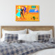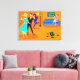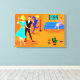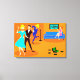 Den här Retro Tecknad Cocktail Party Stretched Canvas har inget inåtvänt ben i sin kropp! Den moderna designen i mitten av århundradet har en levande tecknad teckning i ett vardagsrum och en livlig cocktail party. Det finns ett attraktivt par på dansen golv. Den blonda kvinnan i en turkoklänning och hennes höga, mörk och stilig eskort dansar cha-cha. På golv finns det en postspelare i grönten omgiven av vinylskivor. Ett vackert rödhårig är sitta på en blå soffa. Hon har en lysande rosa klänning på sig. Hennes enda tillbehör är martinisglaset i hennes hand. På hennes sida är en golv-lampa minus skuggan. Var är skuggan? Det är på huvudet på en tipman i ett blått kostym som är party. Han håller också ett martinglas. Den som dekorerade rummet var inte rädd för färg. Den har en orange tegelvägg och en orange golv. På väggen bakom soffa finns en teal- och turkosmålning av en glob med ett svart ram.