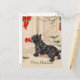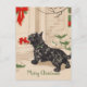 En julkortsdesign från mitten av 1900-talet. En svart skräckare står på framkanten av ett hus med julklapp i hans munnen för att leverera det.Minimal färg som används - benvitt med små röda accenter och grönt. Terrier är svart. "God jul" i grönt