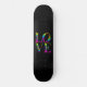 Skateboard-coolan har återgång och slitage på brev som är staplat på "kärlek" på svart bakgrund.