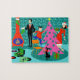 Denna Retro Family Trimming av Julgran Puzzle innehåller alla helgdag utom fruktkakan. 1960 års tecknad är hemma i sitt moderna vardagsrum. Det finns en turkos- och tealtegelvägg och en röd konkamera med en brinnande eld. Pappa bär en svart kostym och röd slips. Han hänger grönt på modets julstrumpor skorsten försiktigt. Vid pappa är Junior prekär i en orange. Oj! Ta det lugnt, Junior! Han håller på att ta fram ett prydnadsföremål på ett kök, rosa, Julgran som redan är utslitet med tealdekorationer och en gult stjärna. På motsatt sida om träd håller Mamma en täckt present. Ingen skakning tillåts! Mamma har en ljusröd tjock klänning med vit stam. Hon har också en julhatt. Under träd finns det en sömnsvart katt som bär en röd båge. På golv finns det en grönt och en svart skivspelare omgiven av färgstarka vinylalbum. Du vet bara att familjen sjunger tillsammans med sina favoritjulgranar sång medan de sliter i salarna.