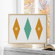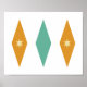 Denna moderna poster i mitten av århundradet har 3 stora diamanter med 2 stjärnor i mitten, i en kombination av färg turkosa blått, orange och grädde. Det skulle göra en roligt till dina väggar!