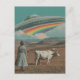 Surreal del av en UFO med regnbåge över boskapsbetet i en bakre stil