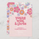Ung Vild och Tre! Retroinspirerad inbjudan till 3-årsdag med 70-tals typsnitt och färger, Blommig i ljust rosa och lila färger.