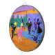 Denna Retro Urban Rooftop Party Dart Board är berusad i sin detaljrikedom. Tecknaden har den typ av viltsofistikerat cocktail party som normalt bara visas i filmer från 1960-talet. Det finns mycket som partierna kan ta in. Gästerna njuter av synen och ambitionen i en lägenhet. Belysningen sätter stämningen och vi kan se de mörka silhuetterna av ett attraktivt par som dansar cha-cha. På golv finns det en lila, bärbar, rekordspelare vid dans pars fötter. Flera album har spridits i närheten. Även med den nedtonade belysningen som gör att praktiskt taget allt i rummet visas i skuggor av lila, blått och svart kan vi säga att alla är klädda till ninerna. Bakom dansen, inomhusparet, finns en gentleman i ett svart kostym som håller ett martinistiskt glas. Han pratar med en skönhet i mörken som står nära en av golv till takglasväggar. En lampa kastar en romantisk glöd på scenen. Den enda sak som saknas är lampskugga. ... Var är skuggan? Det är på huvudet på en tipsy-man som har tagit party utanför orangens tak. Han är helt klart har någon bra dansar och han är inte rädd för att visa dem för världen! Hans följeslagare är en blond kvinna i en ljus rosa klänning. Hennes rygg är öppen när hon kastar tillbaka martini i ett ohämmat mode. Utanför party finns det en andningsande tealskylin, komplett med skyscraper och lila himlar. Om det är så den andra halvan lever, registrera mig!
