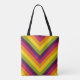 Bilden har en slående schevron mönster som består av fet, färglöst rand som pekar nedåt i en "V"-form. Dessa rand upprepas i ett rytmiskt mode och växlar mellan rik, vibrerande färg: måndag, magenta, orange, gult och oliv grönt. Den övergripande visuella effekten är både retro och energi, vilket framkallar en lekfull men strukturerad estetisk påminnelse om 1970-talets designtrender. Symtomen och upprepningen skapar en känsla av rörelse och riktning, som styr tittarens öga från bildens överkant till mitten. Den höga mättnaden och de starka kontrasterna gör att den passar väl för digitalkonst, bakgrunder eller utskriftsdesignprogram som fångar upp öga.r