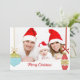Skicka en mjuk retro julhälsning i år med detta platta kort som är redo för ditt favoritfoto och text. Det är designat med en överlagring av två vintage-inspirerade julgransprydnader på band i rött och blåaktig grönt. Byt ut fotot och anpassa din text på framsidan och baksidan och du är klar!