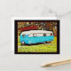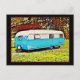 Gamla gamla gamla RV. Retro caravan är ljusblå och vit. Den är omgiven av levande gräs och en liten grönt är bakgrunden. Den här fotokonsten är ren nostalgi.