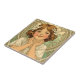 Illustration art nouveau d'une enfant avec des fleurs blanches dans les cheveux, dans un cadre ornementé de rinceaux
