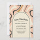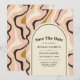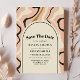 "Retro Swirl Arch Save The Date-kortet" kombinerar skickligt rosa, svarta, gyllene och krämfärgade nyanser och skapar en visuellt slående underrättelse för din speciella dag. De retroinspirerade virvlarna ger det en lekfull, tidlös charm, medan de gyllene accenterna tillför en touch av elegans och firande. Inneslutet i en arkadisk design, inbjuder kortet varmt gästerna att reservera datumet för din kommande bröllopsdag och ger en försmak på det sofistikerade och stilfulla evenemanget som väntar.
