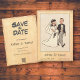Firar din speciella dag med charm och nostalgi! Den här Vintagen Retro Tecknad Bröllop spara-the-date-illustration av tecknad som inspirerats av 1940-talet, inklusive en vismisk frieri-, brud- och groomddans och en klassisk bilscen "Ny gifta". Perfekt för par att söka en unik, snyggt och en lekfull hand för deras firande i bröllop. Fullständigt anpassade och tillgängligt i både tryckt och digital form.