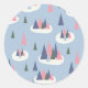 Den här vintagens tittar utformning kommer att se perfekt ut på paket eller som kuvertetiketter för att försegla din skriftliga korrespondens. Modern träd på en snövåg ser modern ut...En modern vibe i mitten av århundradet. Träd är rosa, blått och grönt mot en blå bakgrund. Koordinerar objekt som finns i min butik.