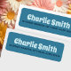 Blåa returetiketter med retrotypografi. Typsnitt och färg kan anpassas med verktyg.