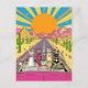 Vykort i en illustration av fem stylistigt klädda katter med solglasögon åker i en rosa som kan konverteras genom ett vibrerande ökenlandskap. Bakgrundsfunktionen accti, berg och en radiant som ställer in sol. Den viskfulla popkonsten stil framkallar en lekfull, bakåtsträvande vibe i resa.