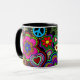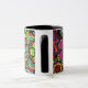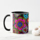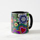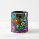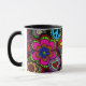 En mugg med en livlig och färgrik design av fredssymboler, paisley, ankhs, hjärtor och blommor. Ett far-out exponerar tillbaka till 60-tal.