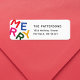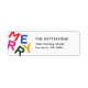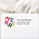 Gå in i en värld av minimalistisk charm och pulserande glädje med denna härliga helgdag med din familj namn och adress vid sidan av färgstarkt fet brev som med lekfull typografi utmärker "Merry" från ord.