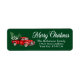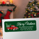 En vacker returadressetikett för helgdag med ett modernt kalligrafiskript God jul med en vattenfärgad vintage röd lastbil, julgranar och snö. Skogens Grönt - bakgrund.