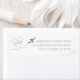 Modern minimalistisk resemetretrateregibel adressetikett för ett målbröllop eller en möhippa för resetema med en retro-inspirerad estetik som visas i grått och vit typografi med en logotyp för flygplanshjärtspåret bröllop i hörnet. Färg och typsnitt är redigerbara så att du kan använda den här mallen så att den stämmer överens med din exakta mottagningssvit för resetema.