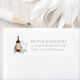 Designad för att matcha vår Cheers to Love-inbjudan samling, returadressetiketter har en flaska burgunderrött vin och två vinglas på en bädd av gröna akvarell eukalyptusblad och botanisk lövverk.