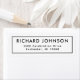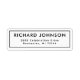 Elegant returetiketter med mall fält för ditt namn och adress. Vit text mot svart bakgrund.